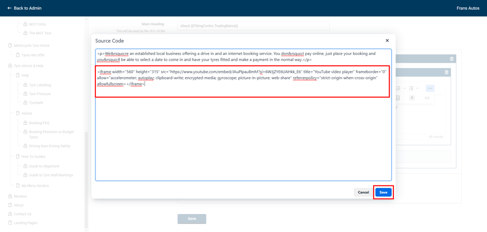 Click the Copy button to get the code. Then load up the Tyres and Service admin and go to "Design" and then "Edit Content".